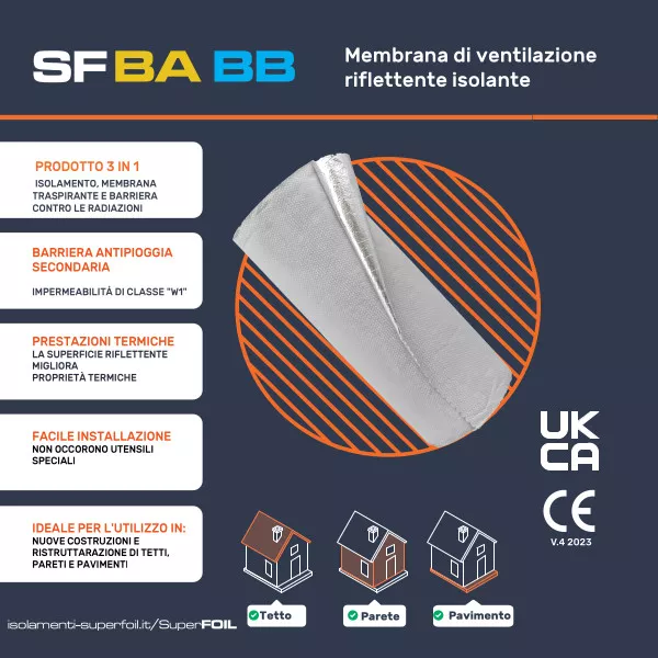 SuperFOIL SFBA BB è una membrana ventilante, riflettente e traspirante, altamente tecnologica, con isolamento a bolle d'aria a bassa emissività, è il prodotto giusto per la protezione e l'isolamento della casa. Rappresenta una scelta conveniente e intelligente per proteggere la tua casa dalle condizioni atmosferiche esterne, dall'umidità, dalla condensa e da tutti i potenziali danni causati dall'acqua. Appositamente progettato con una membrana impermeabile certificata "W1", SuperFOIL SFBA BB offre un'eccellente protezione per la tua casa e soddisfa gli standard di efficienza energetica del Regno Unito. SFBA BB minimizza la formazione di condensa, corregge gli sbalzi di temperatura, fornisce un'ottima protezione e pone rimedio alle perdite energetiche, aumentando il comfort e il risparmio.