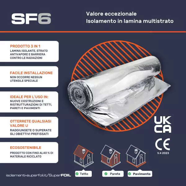 Abbiamo progettato SuperFOIL SF6 pensando ai tuoi obiettivi di isolamento, al tuo budget e a tutti gli standard di qualità. Che tu sia un professionista o un hobbista, questa conveniente soluzione ti soddisferà sotto ogni aspetto. Ideale per casette da giardino, garage, capannoni, verande e altro ancora, SF6 si distingue per essere l'isolante multistrato più sottile, flessibile e versatile disponibile sul mercato.