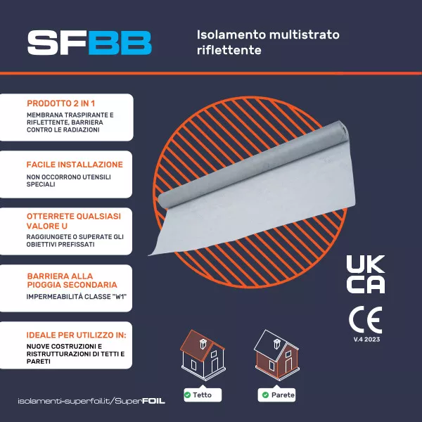 SFBB è una membrana traspirante e riflettente altamente avanzata, con la caratteristica di fornire una barriera radiante; costituisce una scelta intelligente ed economica per proteggere la vostra casa dalle condizioni meteorologiche, dall'intrusione di umidità e dai potenziali danni causati dall'acqua. Appositamente progettata con una membrana impermeabile certificata "W1", SFBB offre un'eccellente protezione per la tua casa ed è conforme agli standard europei di efficienza energetica.